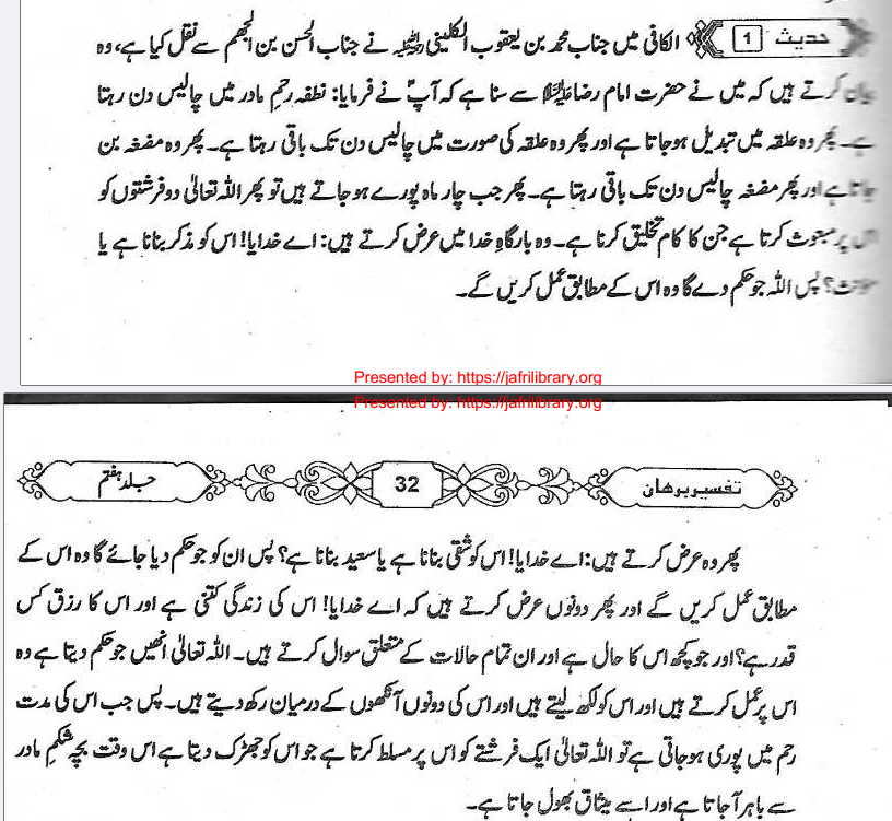 English Translation: The drop remains in the womb for forty nights and then the blood congeals and then it becomes a blood clot and then a lump of flesh…